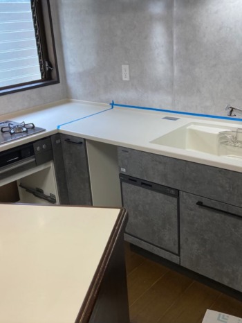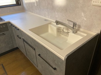 シンク、ワークトップはベージュのアクリル人工大理石を設置。お洒落度、清潔感が上がりました。