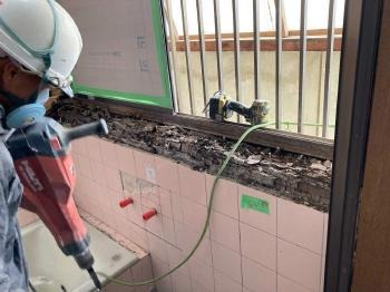 新しく樹脂窓枠が付くので、窓廻りのタイルも解体します
