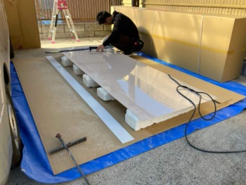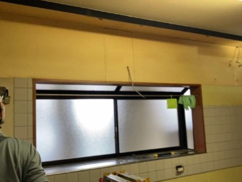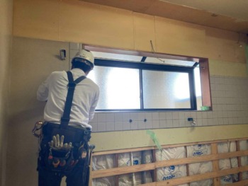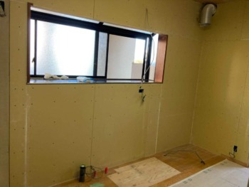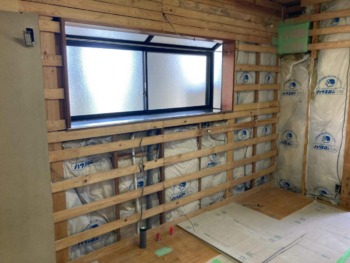ウォールユニットの取り付け部に下地を入れ、全面に断熱材を入れ、ボードを貼ります。