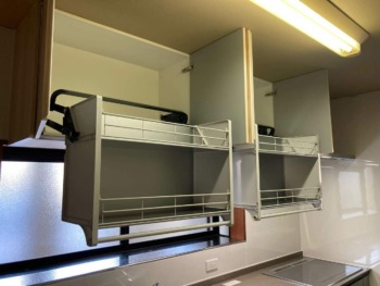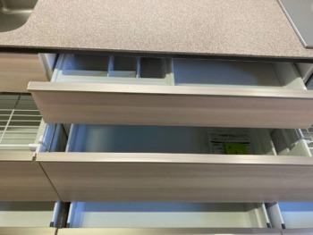 | ご提案内容 | 調理道具の収納でお困りでしたので、ウォールキャビネットには高いところに収納した物も取り出しやすいダウンウォール付をお勧めしました。また、フロアユニットも収納した物が一目で分かり取り出しやすいスライドストッカー・アシストポケット・シェルフ付きの引き出しタイプをお勧め致しました。また、ワークトップは、耐久性にも優れた人造大理石をご提案させていただきました。 |
