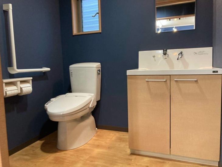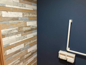 便器正面の壁は、木目調のアクセントクロスで、より個性的でおしゃれな空間になりました