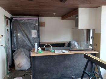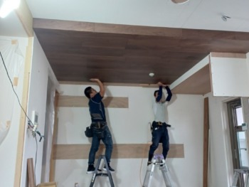 キッチン天井のクロス貼付けです☆グッと雰囲気が変わります