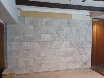 LDKテレビ設置側の壁には凹凸のあるタイルの雰囲気が強いエコカラットをご選定いただきました