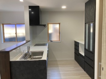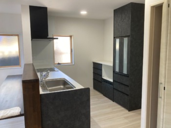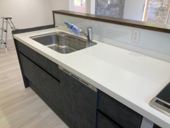 | 使用商材 | LIXILシステムキッチン シエラS 2550 IH 食器洗い機 深型 カップボード付き/ LIXIL プレアス LSタイプ ブルーグレー/TV裏エコカラット パールマスクⅡ/リデアMタイプ |