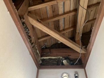 2階には物置スペースだった場所を利用してトイレを新しく作りますので、1階トイレの天井を一旦解体して2階トイレ用の配管をします。