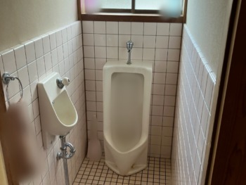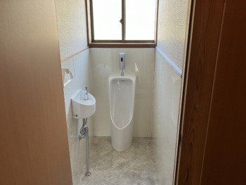 小便器室も改修完了です! タイルだったお部屋が清掃しやすいクッションフロア&壁はつるつるのメラミン化粧版(セラール)張りになりさっと拭き取るだけできれいになります!