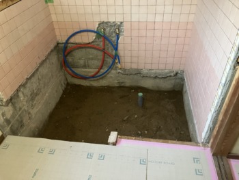 解体後新しいシステムバスに合わせて給水・給湯・排水を配管し直していきます。