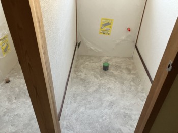 1階トイレの床はタイルの上にベニヤを貼りクッションフロアを貼りました。