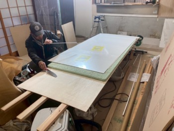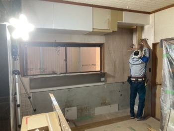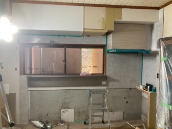 新しくキッチンパネルを貼るために壁の下地を作ります
