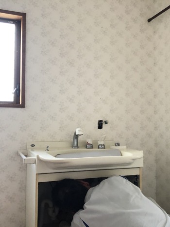 既存の洗面化粧台を撤去する為に、給水管・排水管を取り外します。