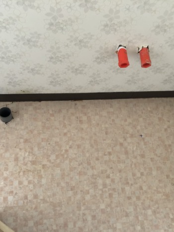<洗面化粧台撤去後> 壁紙クロスやフロアシートも掃除し、新しい洗面化粧台を取り付けます。