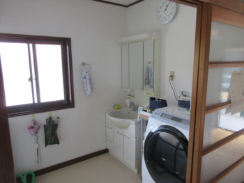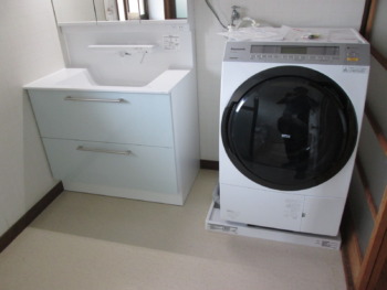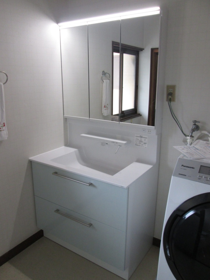 脱衣場の空間を最大限に活用していただけるように、 洗面化粧台の幅の広いタイプをご提案させていただきました。 洗面台には、お掃除も手軽で、収納スペースの多い 「TOTO オクターブ」をご提案させていただきました。 また、洗面台交換の際に妨げになる洗濯機用の排水口の移設もご提案させていただきました。 |
