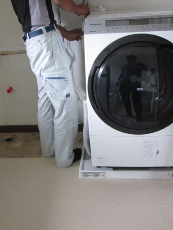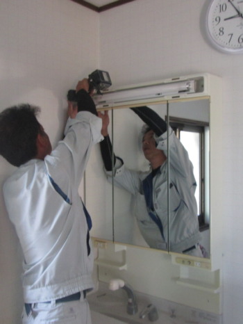 洗面台を搬入し、設置します。 水・お湯の出水の確認・排水の確認も行います。