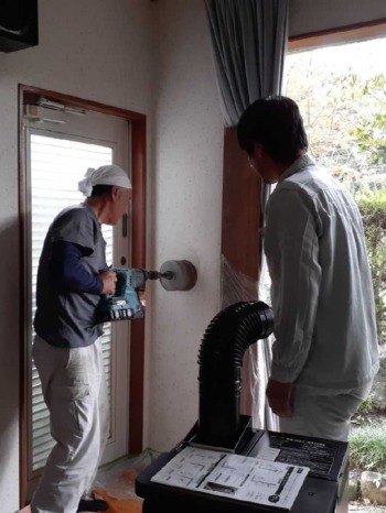 室内のフローリングや、外壁に傷がつかないように、しっかり養生をして配管用の穴を作ります。