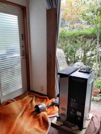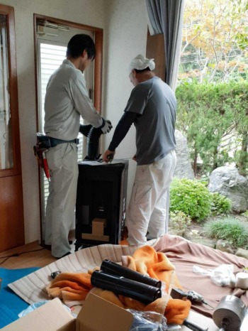 まずは設置場所にペレットストーブを仮置きして、排気管の位置を確認します。
