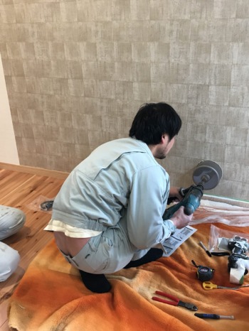 排気管設置壁に、専用工具を使用し穴をあけます。