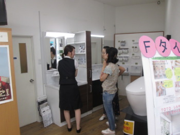 TOTOショールームにて実物を見て使用を検討中の奥様と娘様