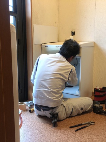 本体に水栓金具を取り付け、設置場所に移動させます。
