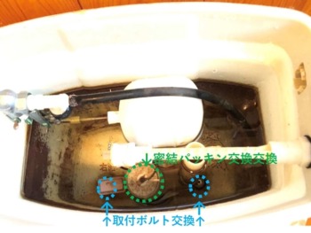 トイレ水漏れの現地調査の結果 ①便器とタンクを固定する締め付けボルトの交換 ②タンクと便器を接続する際に密結パッキンの交換 ③青錆が発生して劣化したアングル止水栓の交換 |