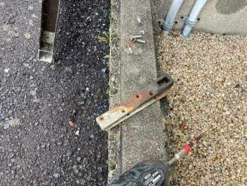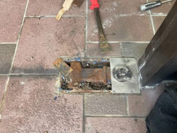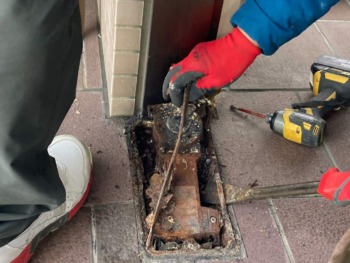 フロアヒンジの状態です。雨の影響でフロアヒンジ内部が錆びている可能性がありました。