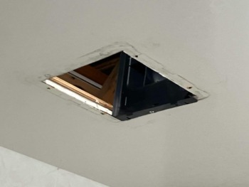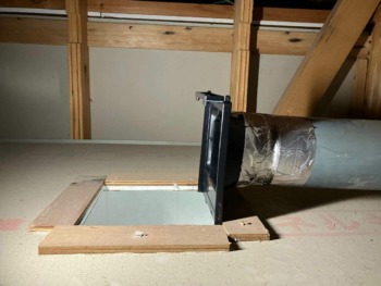 浴室の天井点検口を開け、そこからダクトとアダプターを固定しているテーピングを剥がします。