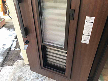 新しい玄関ドアの小扉を先に取り付けます。