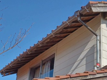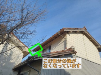 写真の○の部分の雨樋が飛んでなくなってしまっていました。