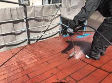 高圧洗浄で風化した表面、古い塗膜を徹底的に洗い流します