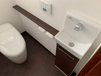 | ご提案内容 | 今回はTOTOネオレストRH1タイプと手洗いカウンター(スリム)とコーナーキャビネットも新設。段差のあった廊下をトイレの床と合わせることでバリアフリー仕様をご提案しました。 |