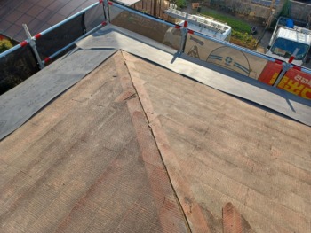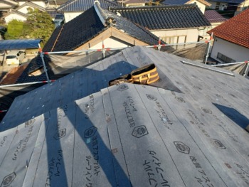 全体的に防水シートで保護して屋根を貼っていきます。