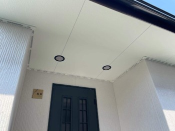 玄関軒天はセラドングリーンで外壁の白と若干の色味の違いを出しています。