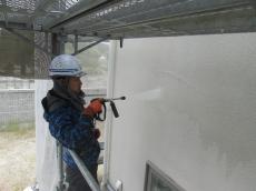 高圧洗浄機にて壁の汚れを落としていきます
