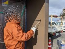 外壁玄関部分の 塗装上塗り一回目の様子です。