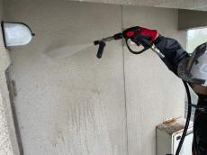 高圧洗浄機で外壁の汚れを落としていきます。