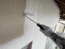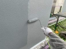 外壁上塗りの様子です。凹凸のない仕上げ方法をお選びいただきましたので職人が、なめらか仕上げていきます。
