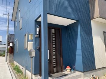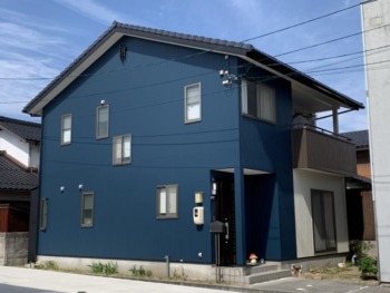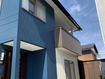 外壁のお色は8108マウンテンブルーと8091ブロークンホワイトの2色で。ベランダの色を8074アイアンバーグのお色で塗装致しました