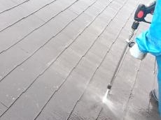 高圧洗浄です。この作業をすることにより塗料の密着性を向上します。