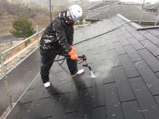 まずは屋根、外壁の汚れを高圧洗浄で汚れを削ぎ落していきます。