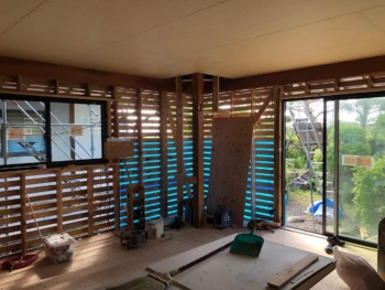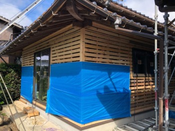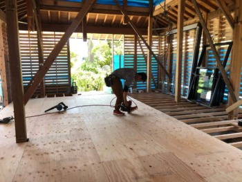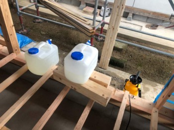 水溶液処理後は、残熱材を施工して構造用合板を敷き並べていきます